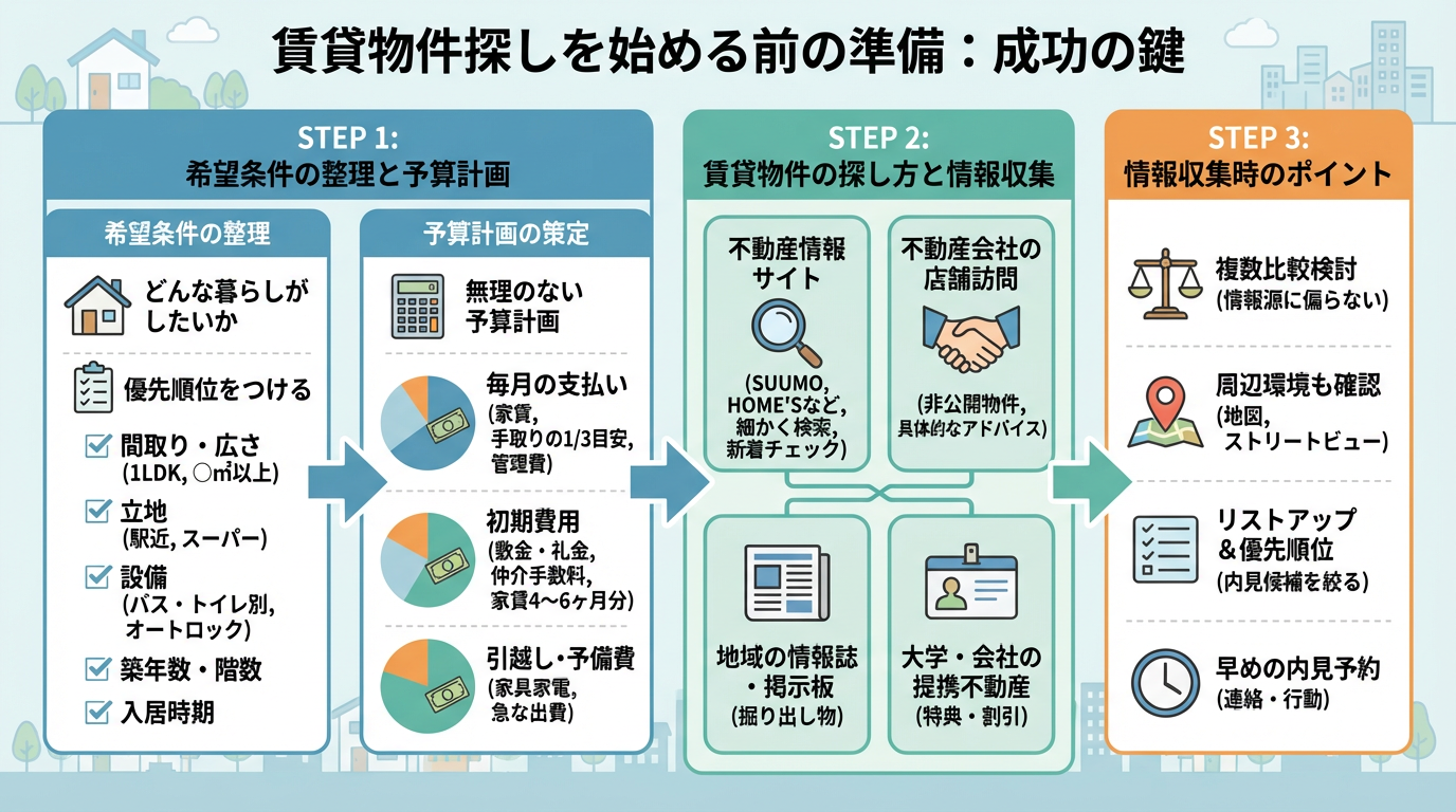 賃貸契約は、人生の大きな節目となる重要な手続きです。後悔のない物件選びをするためには、物件探しを始める前の準備が成功の鍵を握ります。漠然と物件を探し始めるのではなく、自身の希望や予算を明確にすることで、効率的かつ納得のいく物件探しが可能になります。