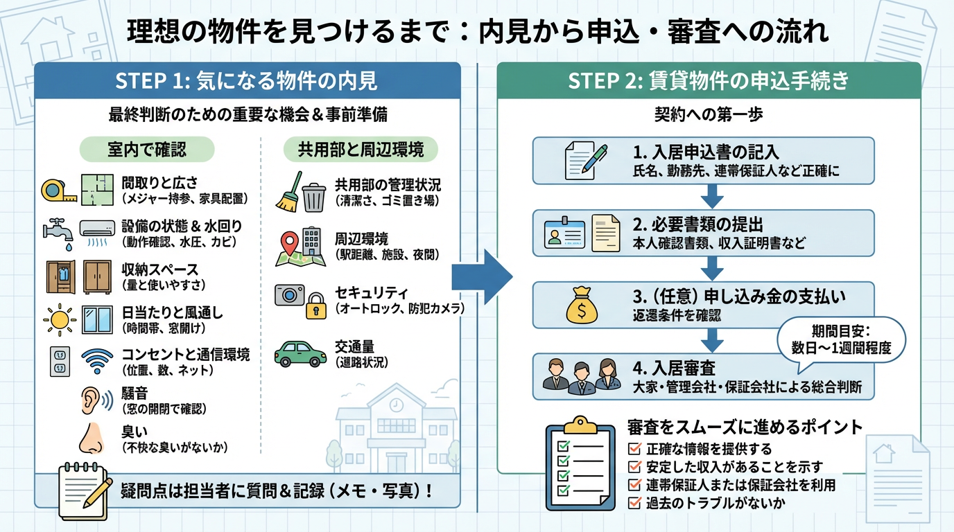 賃貸物件探しにおいて、インターネットや情報誌で理想に近い物件を見つけたら、次はいよいよ実際の物件を確認するステップへと進みます。この段階では、写真だけではわからない物件の雰囲気や周辺環境、そして住み始めてから後悔しないための細かなチェックが非常に重要になります。