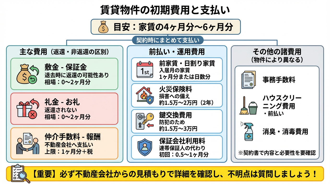 賃貸契約時に一度だけ支払う費用で、一般的に家賃の4~6ヶ月分が目安となります。これには、敷金、礼金、仲介手数料、前家賃、火災保険料、鍵交換費用などが含まれます。詳細は「賃貸物件の初期費用と支払い」の章で詳しく解説しますが、事前に概算を把握しておくことが重要です。