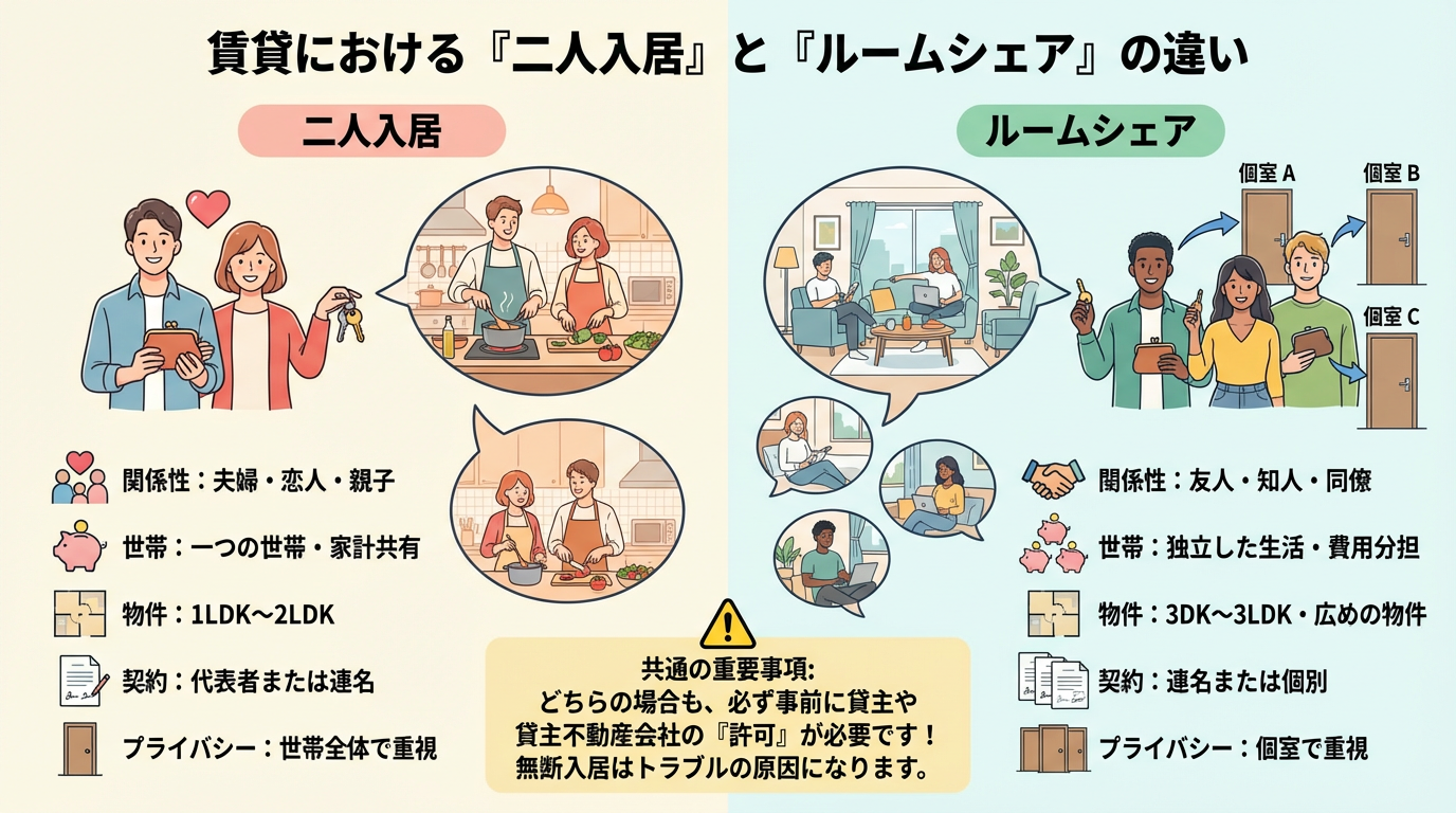 | 主な目的 | 同棲、共同生活、家族としての居住 | 家賃や生活費の分担、共同生活による交流 |
