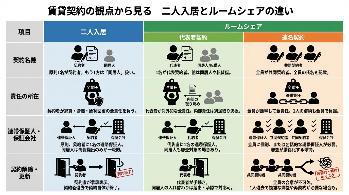| 契約形態 | 代表者契約(同居人明記)または連名契約 | 代表者契約(同居人明記)または連名契約、ルームシェア専門物件での個別契約 |