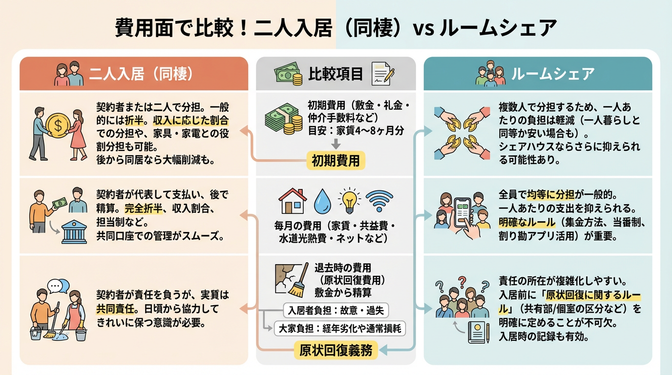 | 費用項目 | 二人入居(同棲)の場合 | ルームシェアの場合 |