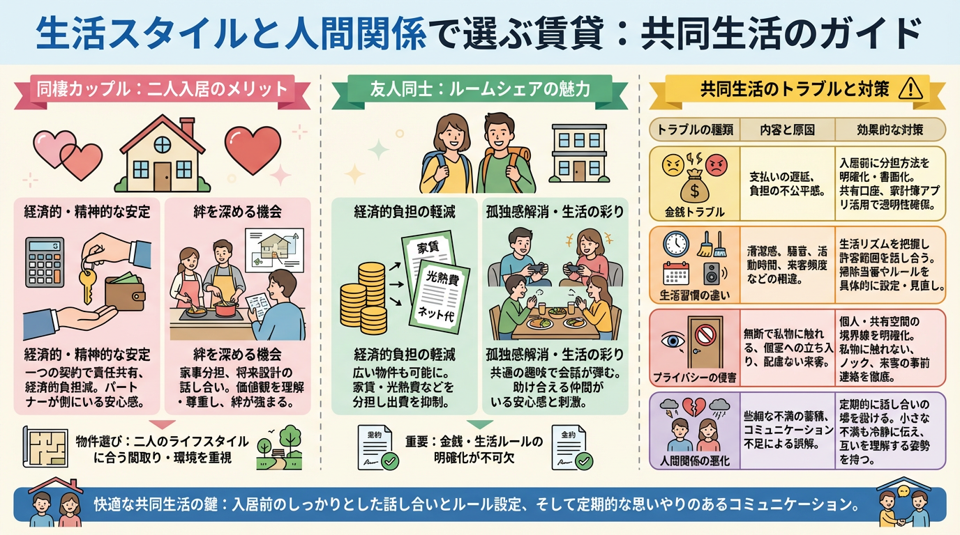 二人入居とルームシェアは、それぞれ異なる魅力と注意点があります。契約形態、費用、そして何よりも共同生活を送る相手との関係性や生活スタイルを考慮し、どちらが自分たちのニーズに合っているかを慎重に検討することが重要です。