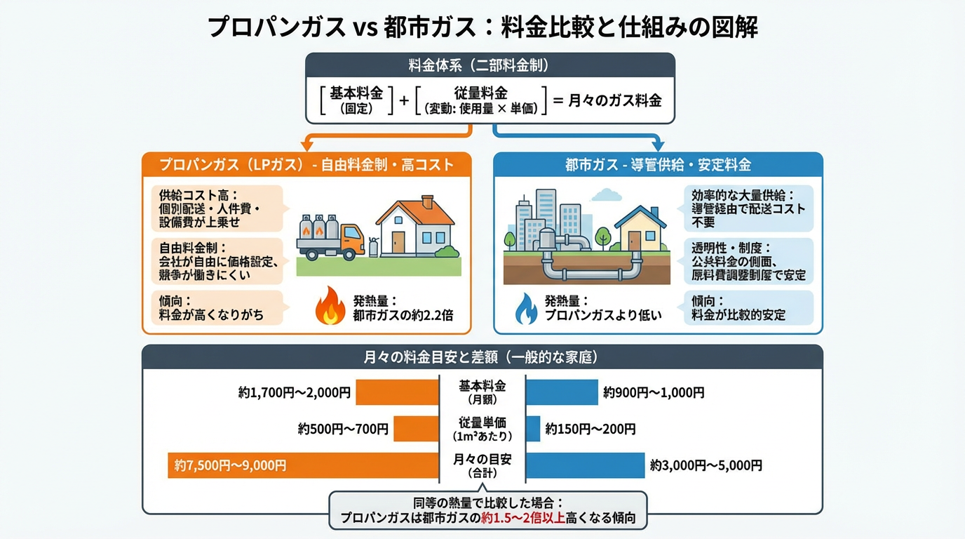 プロパンガス料金が都市ガスに比べて高くなりがちなのには、いくつかの構造的な理由があります。