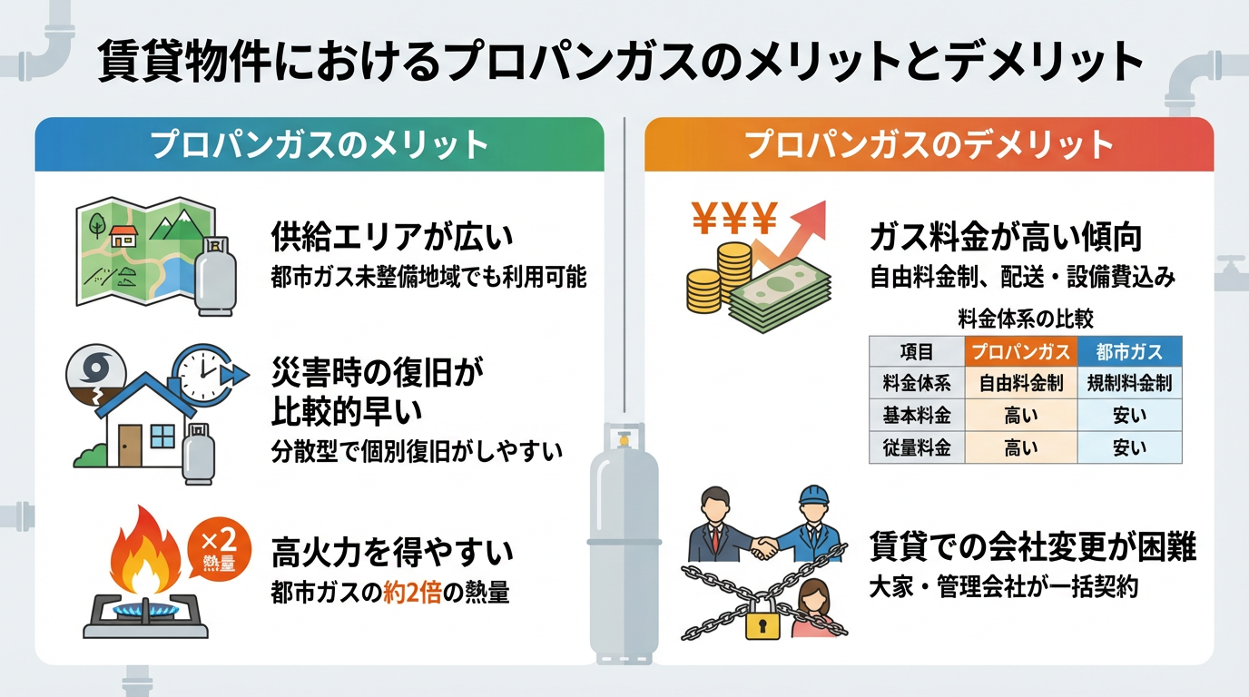 賃貸物件でプロパンガスを利用する場合、都市ガスにはない独自のメリットとデメリットが存在します。これらの特性を理解することは、快適な暮らしと家計管理において非常に重要です。