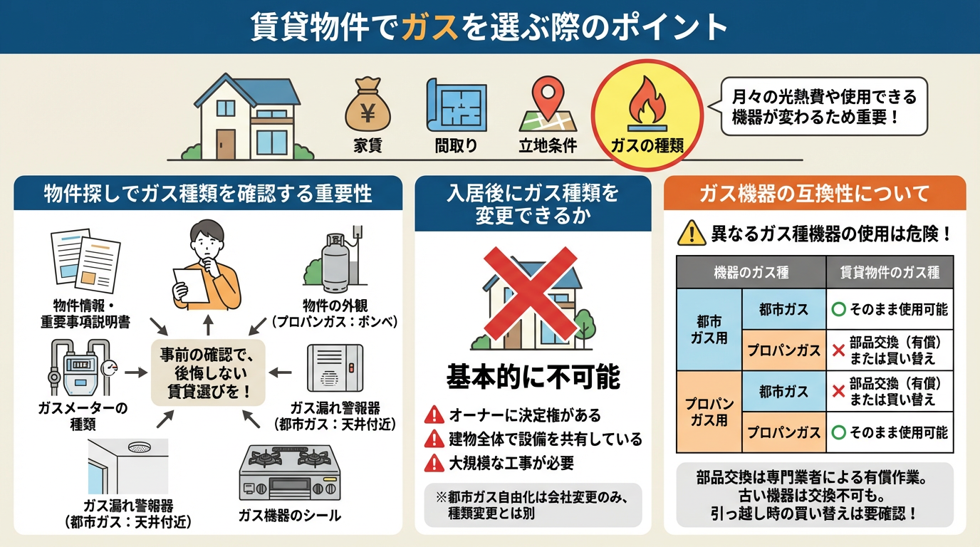 賃貸物件では入居後にガス種別を変更することは困難なため、物件探しの段階で必ずガス種別を確認し、自身のライフスタイルや予算に合った選択をすることが賢明です。ガス機器の互換性も忘れずにチェックしましょう。