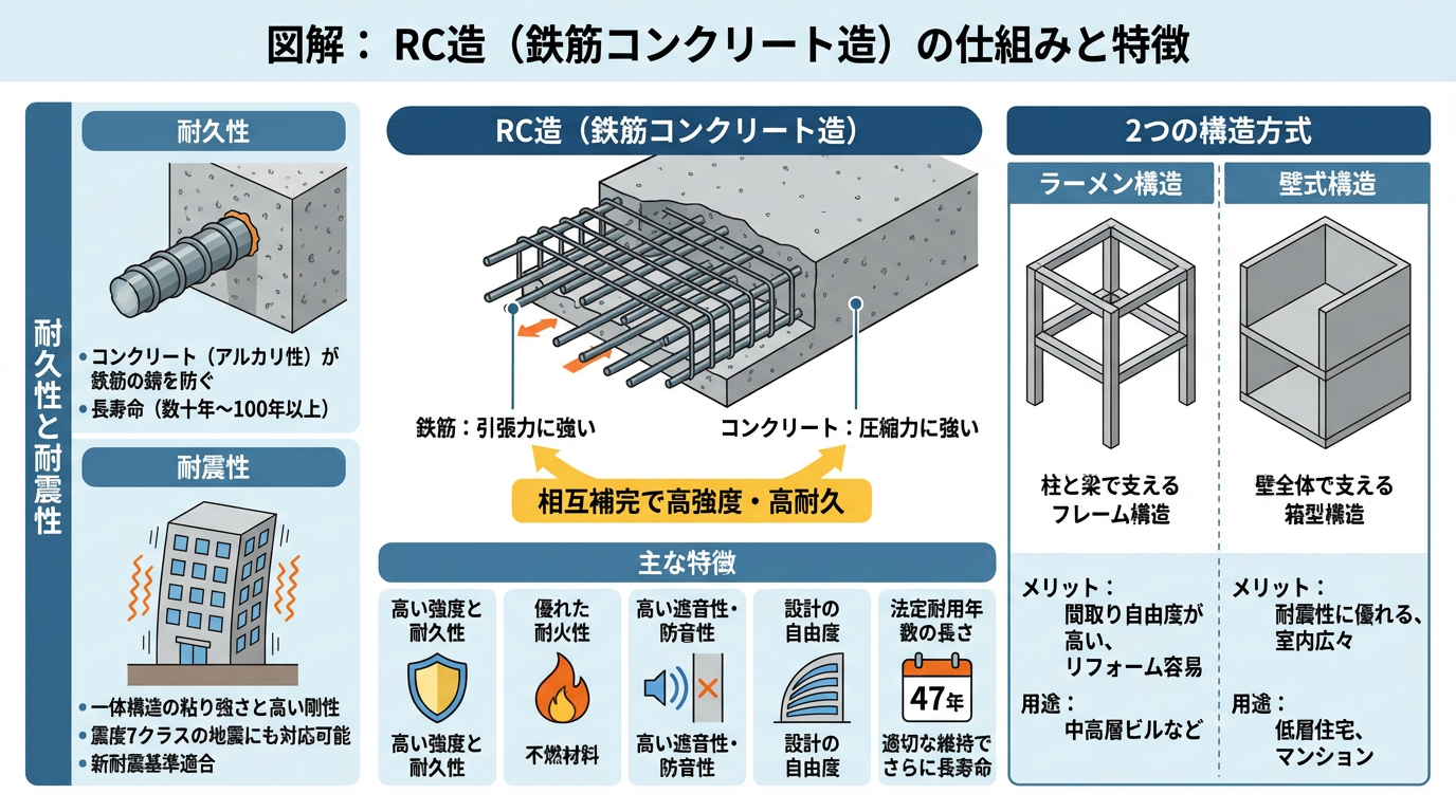 RC造は、その構造特性から極めて高い耐久性と耐震性を誇ります。