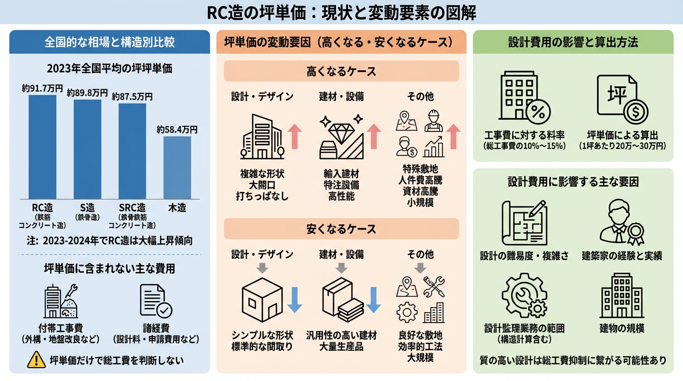 RC造(鉄筋コンクリート造)住宅の建築を検討する際、費用に関する最も基本的な指標となるのが坪単価です。しかし、この坪単価は、多くの要因によって大きく変動するため、その現状と変動要素を深く理解することが重要となります。