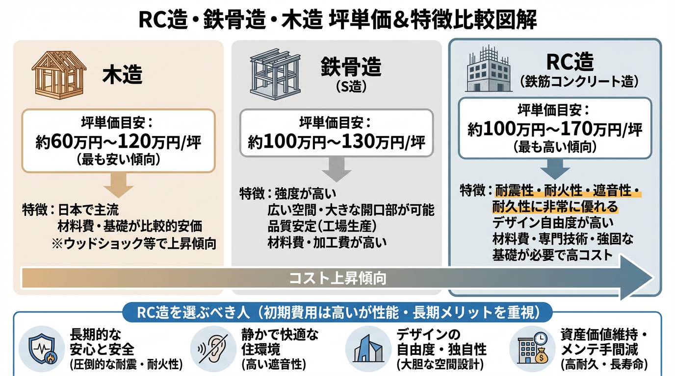住宅の建築を検討する際、構造は費用だけでなく、住み心地や耐久性にも大きく影響する重要な要素です。ここでは、RC造(鉄筋コンクリート造)と、日本の戸建て住宅で主流である木造、そしてマンションやビルにも多く採用される鉄骨造の坪単価を比較し、それぞれの特徴と、どのような人にRC造が適しているのかを詳しく解説します。