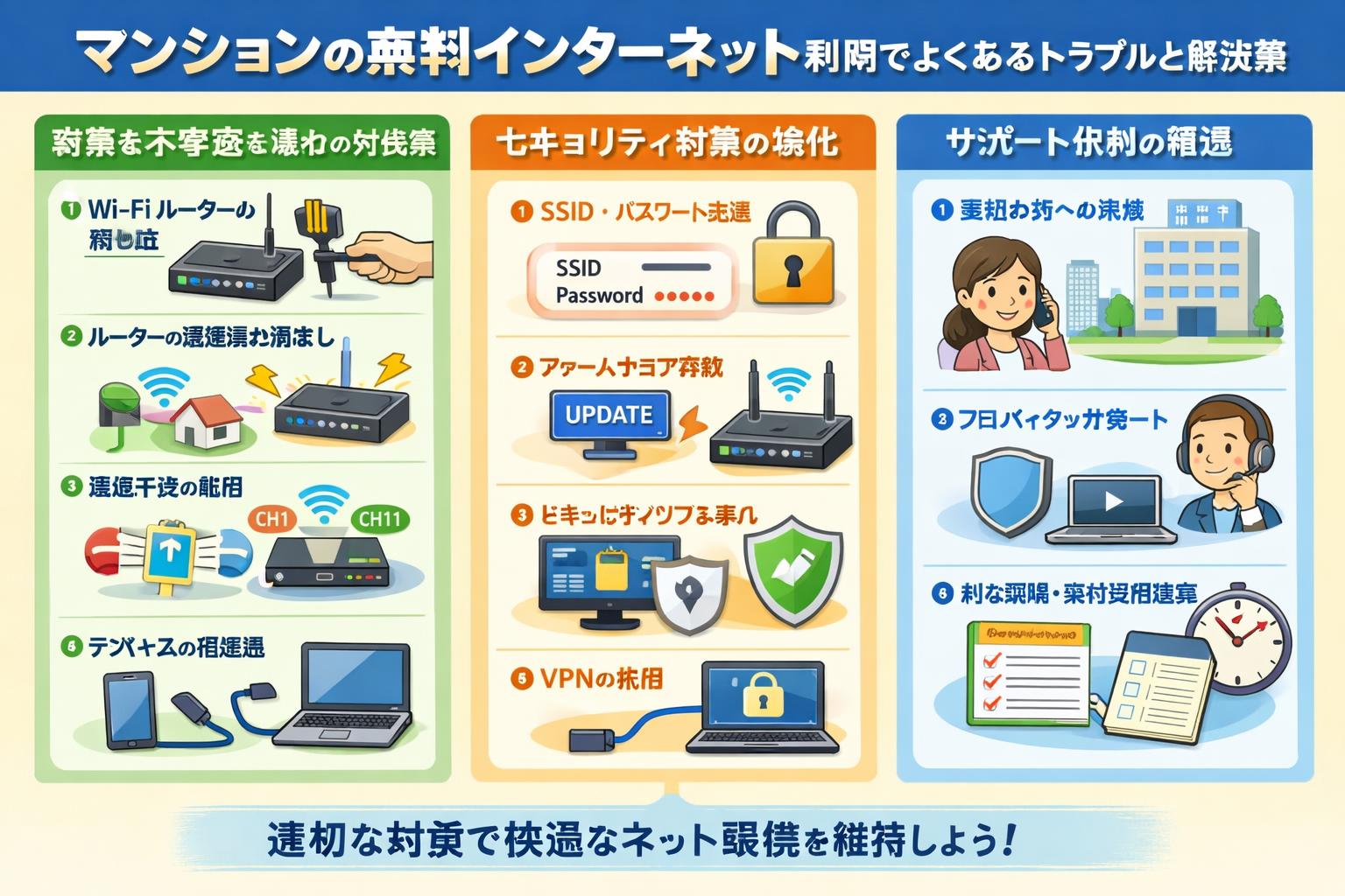 マンションの無料インターネットは便利なサービスですが、利用中に様々なトラブルに遭遇することもあります。ここでは、よくある問題とその解決策を具体的に解説し、快適なインターネット環境を維持するためのヒントを提供します。
