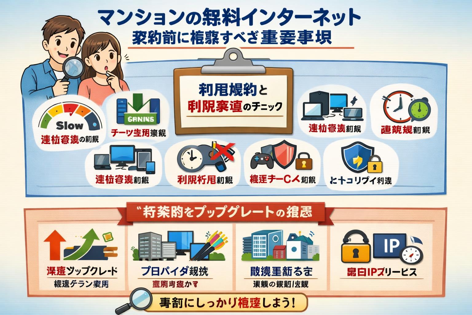 マンションの無料インターネットは、追加費用なしでインターネットが利用できる魅力的なサービスです。しかし、契約後に後悔しないためには、事前にいくつかの重要事項を確認しておくことが不可欠です。ここでは、特に注意すべきポイントを詳しく解説します。