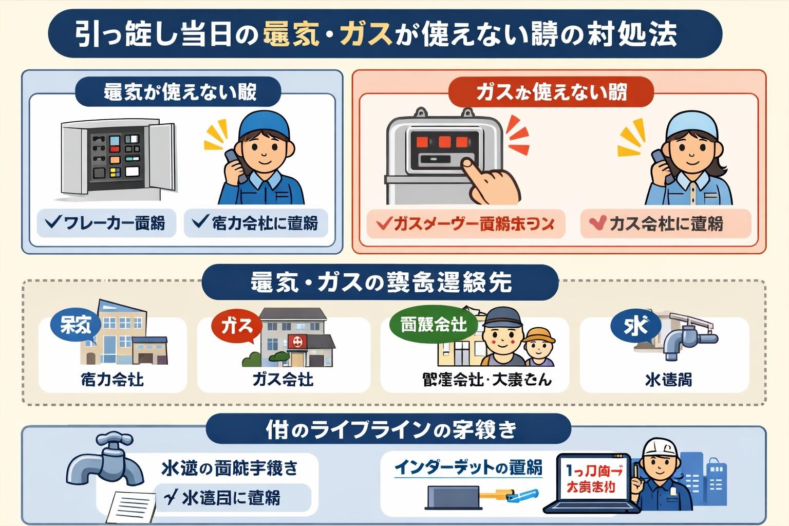 引っ越しは何かとバタバタし、予期せぬトラブルが発生することもあります。特に、新生活の基盤となる電気やガスが使えないと、大きな支障をきたします。ここでは、引っ越し当日に電気やガスが使えない場合の対処法や、万が一の事態に備える緊急連絡先、そして電気ガスと合わせて検討すべき他のライフラインについて詳しく解説します。