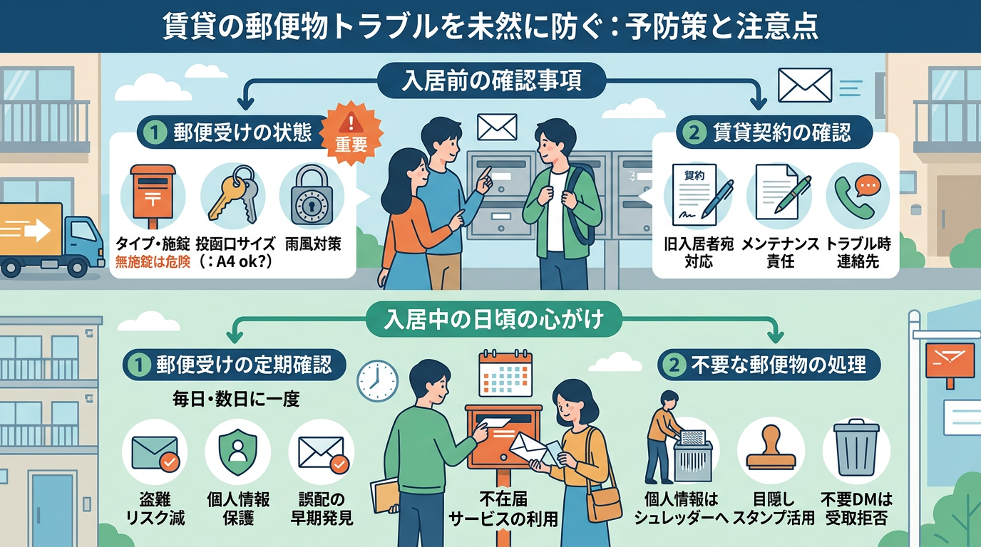 賃貸物件での郵便物トラブルは、入居前の確認から日々の心がけまで、少しの注意で未然に防ぐことが可能です。ここでは、安心して郵便物を受け取るための予防策と、もしもの時に役立つ注意点を詳しく解説します。