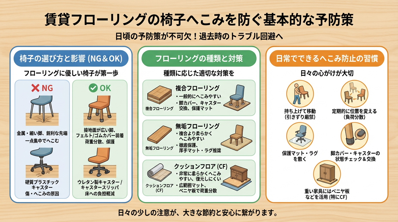 賃貸物件のフローリングを長持ちさせ、退去時の無用なトラブルを避けるためには、日頃からの予防策が不可欠です。ここでは、椅子の選び方からフローリングの種類に応じた対策、そして日常で実践できる習慣まで、基本的な予防策を詳しくご紹介します。