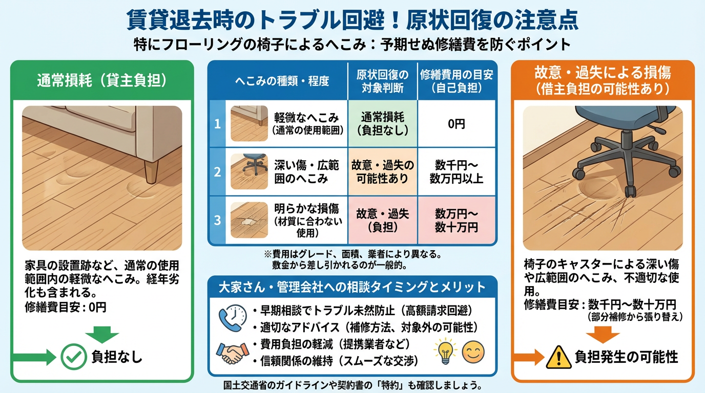 賃貸物件を退去する際、多くの入居者が頭を悩ませるのが「原状回復」の問題です。特にフローリングの椅子によるへこみは、その判断が難しく、予期せぬ修繕費用を請求されるケースも少なくありません。ここでは、退去時のトラブルを未然に防ぐための重要なポイントを解説します。