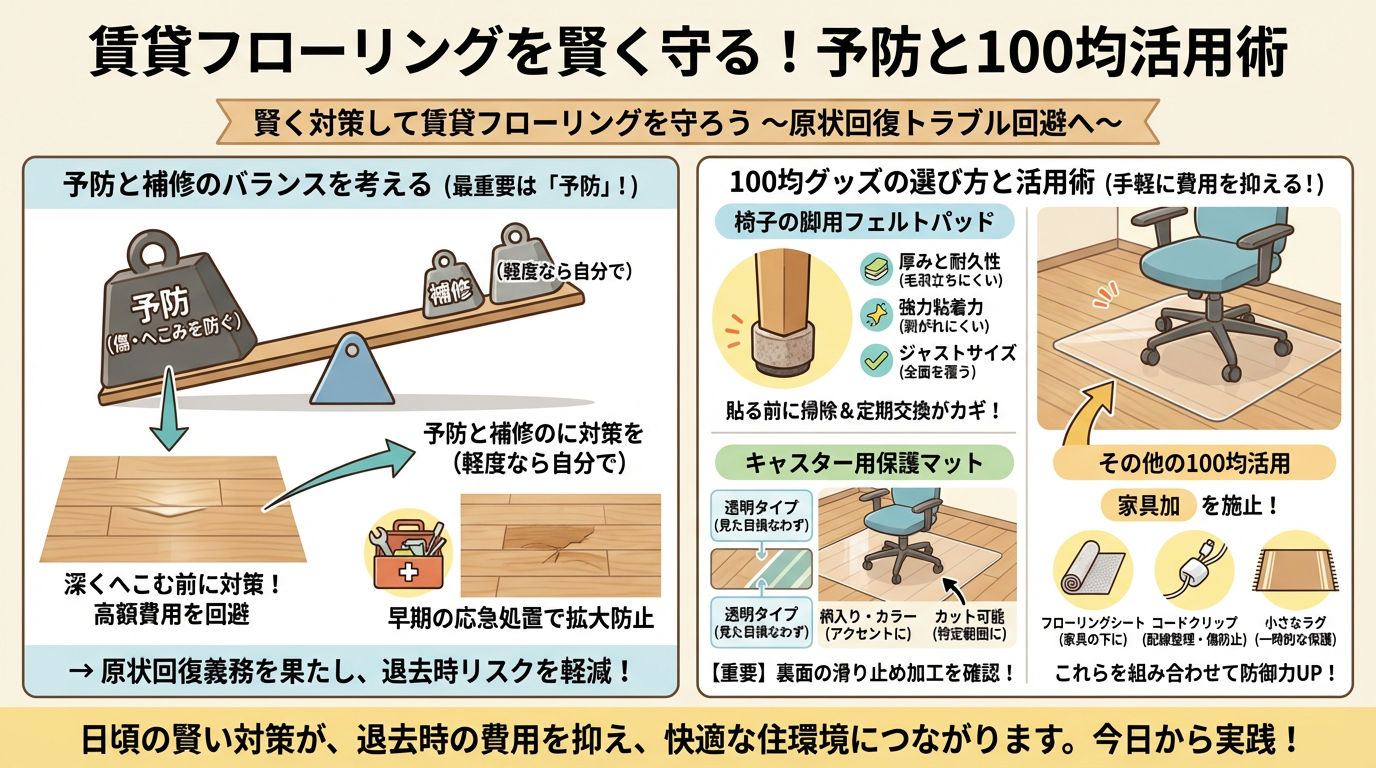 賃貸物件のフローリングを長持ちさせ、退去時の無用なトラブルを避けるためには、日頃からの賢い対策が不可欠です。予防と補修のバランスを理解し、手軽に手に入る100均グッズを上手に活用することで、費用を抑えながら快適な住環境を維持できます。