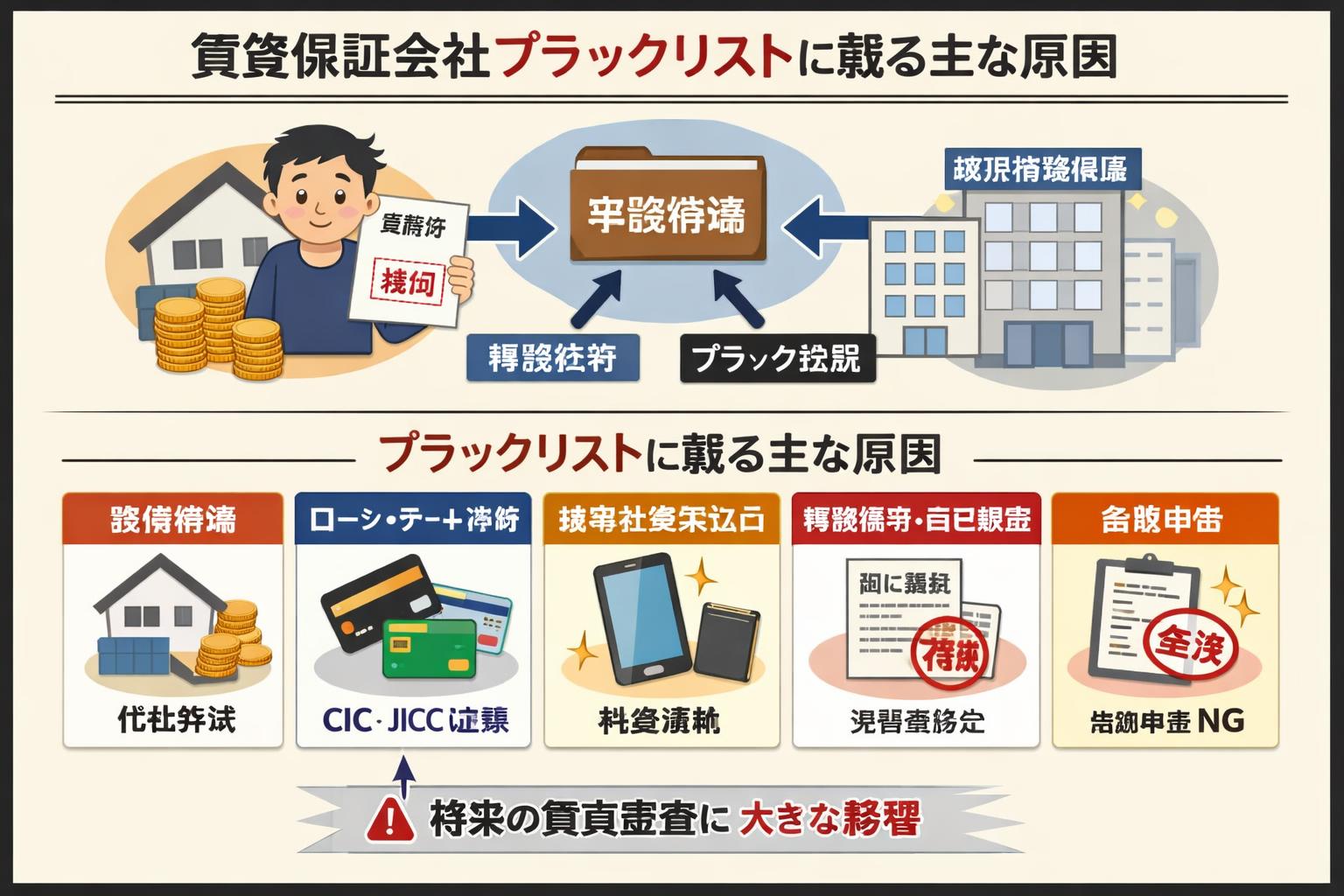 賃貸保証会社の審査に落ちる原因として「ブラックリスト」という言葉が使われることがありますが、これは法的に存在するリストではなく、賃貸保証会社間で共有されるネガティブな情報や、個人の信用情報機関に記録された事故情報を指すことが一般的です。これらの情報が賃貸保証会社の審査において不利に働く主な原因を詳しく解説します。