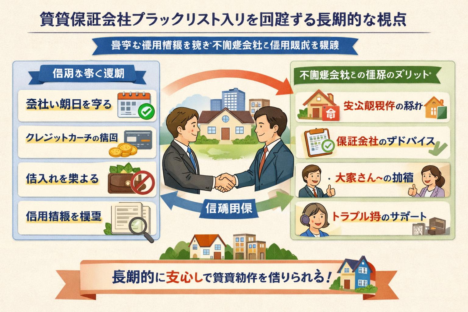 賃貸保証会社のブラックリストに一度載ってしまうと、その後の住まい探しに大きな影響を及ぼす可能性があります。短期的な対策はもちろん重要ですが、長期的な視点で良好な信用情報を築き、不動産会社との信頼関係を構築することが、将来にわたって安心して賃貸物件を借りるための最も確実な方法となります。
