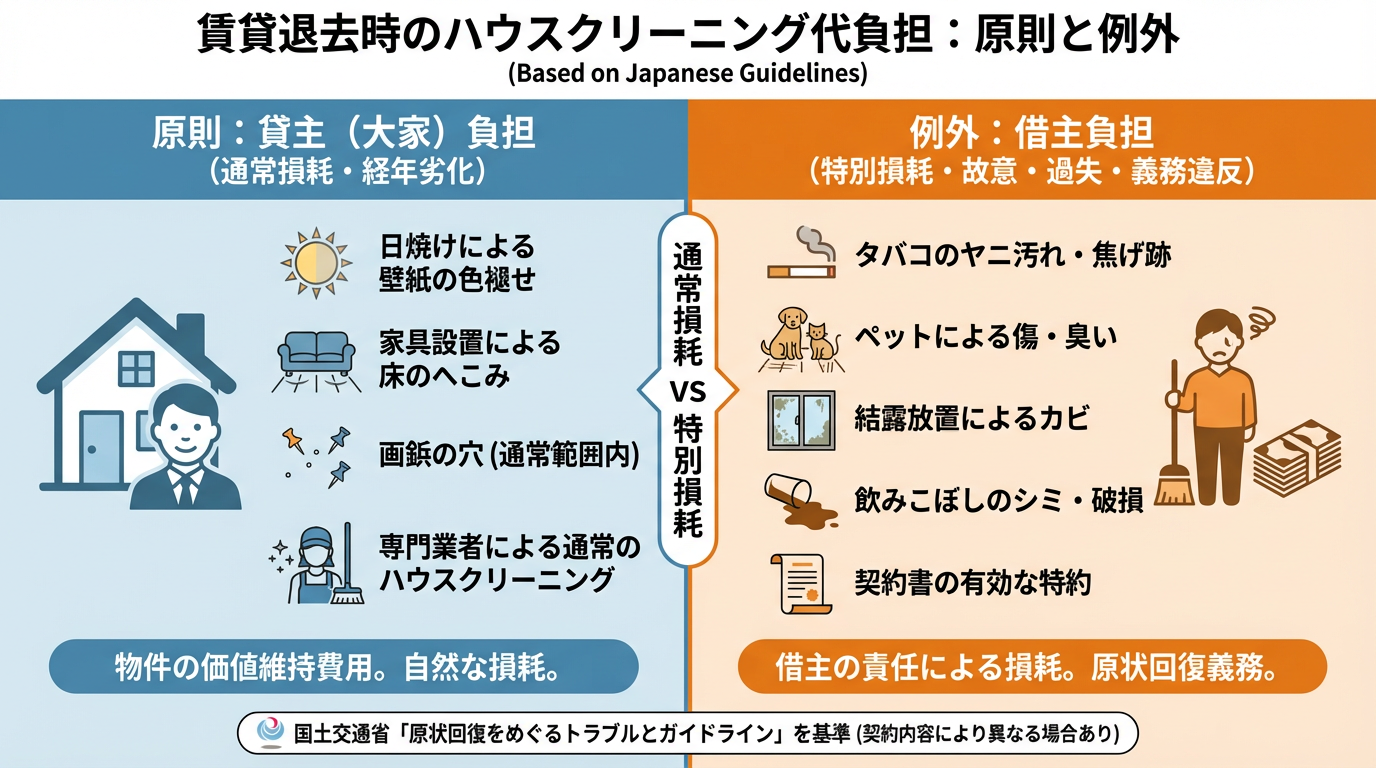 賃貸物件を退去する際、多くの借主が気になるのが「ハウスクリーニング代は誰が負担するのか」という点です。この費用負担については、法律や慣習、そして賃貸借契約の内容によって細かく定められています。原則として、国土交通省のガイドラインに基づき、通常のハウスクリーニング費用は貸主(大家さん)が負担するものとされています。しかし、例外的に借主が費用を負担しなければならないケースも存在します。