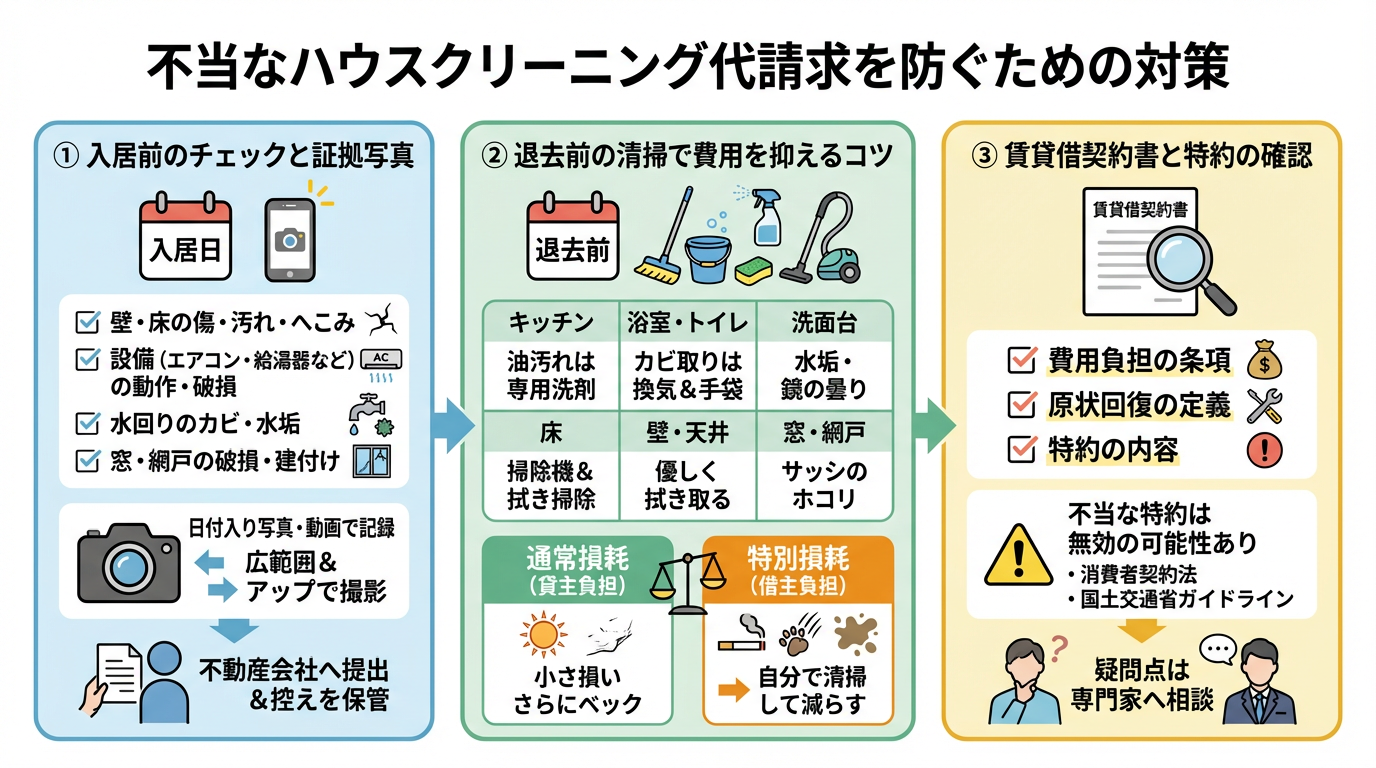賃貸物件の退去時に、不当なハウスクリーニング代を請求されるケースは少なくありません。このようなトラブルを未然に防ぐためには、入居前から退去時までの適切な行動と知識が不可欠です。ここでは、借主が自身の権利を守り、余計な費用負担を避けるための具体的な対策をご紹介します。