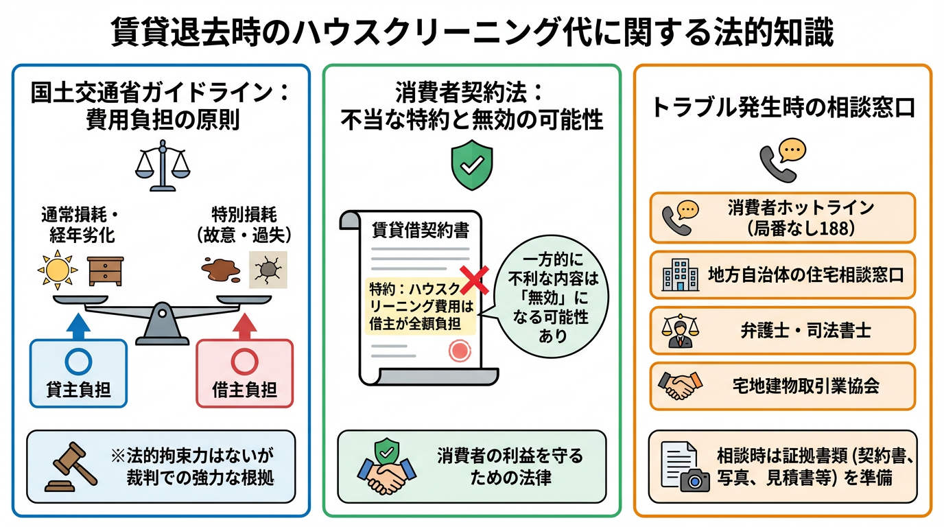 賃貸物件の退去時におけるハウスクリーニング代の負担は、しばしばトラブルの原因となります。しかし、関連する法的知識を理解しておくことで、不当な請求から身を守り、円滑な退去手続きを進めることが可能です。ここでは、国土交通省のガイドライン、消費者契約法、そしてトラブル発生時の相談窓口について詳しく解説します。