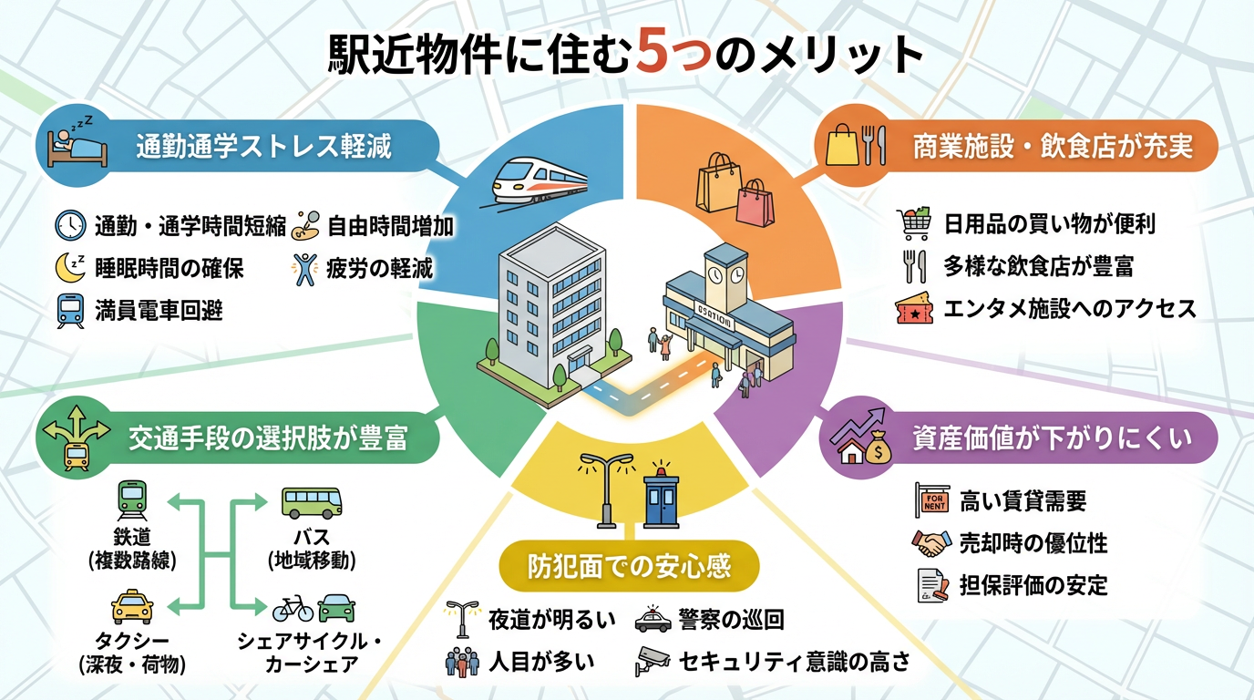 駅近物件が多くの人に選ばれる理由は、その利便性の高さと資産価値の安定性に集約されます。主な理由は以下の通りです。