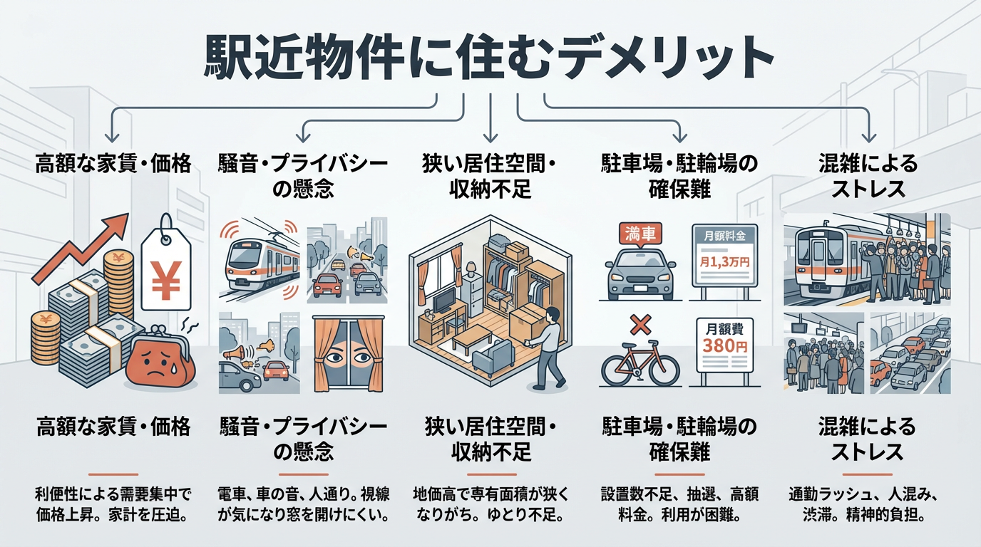 駅近物件は利便性が高い一方で、快適な生活を送る上で考慮すべきいくつかのデメリットも存在します。これらの点を事前に把握しておくことで、後悔のない物件選びにつながります。