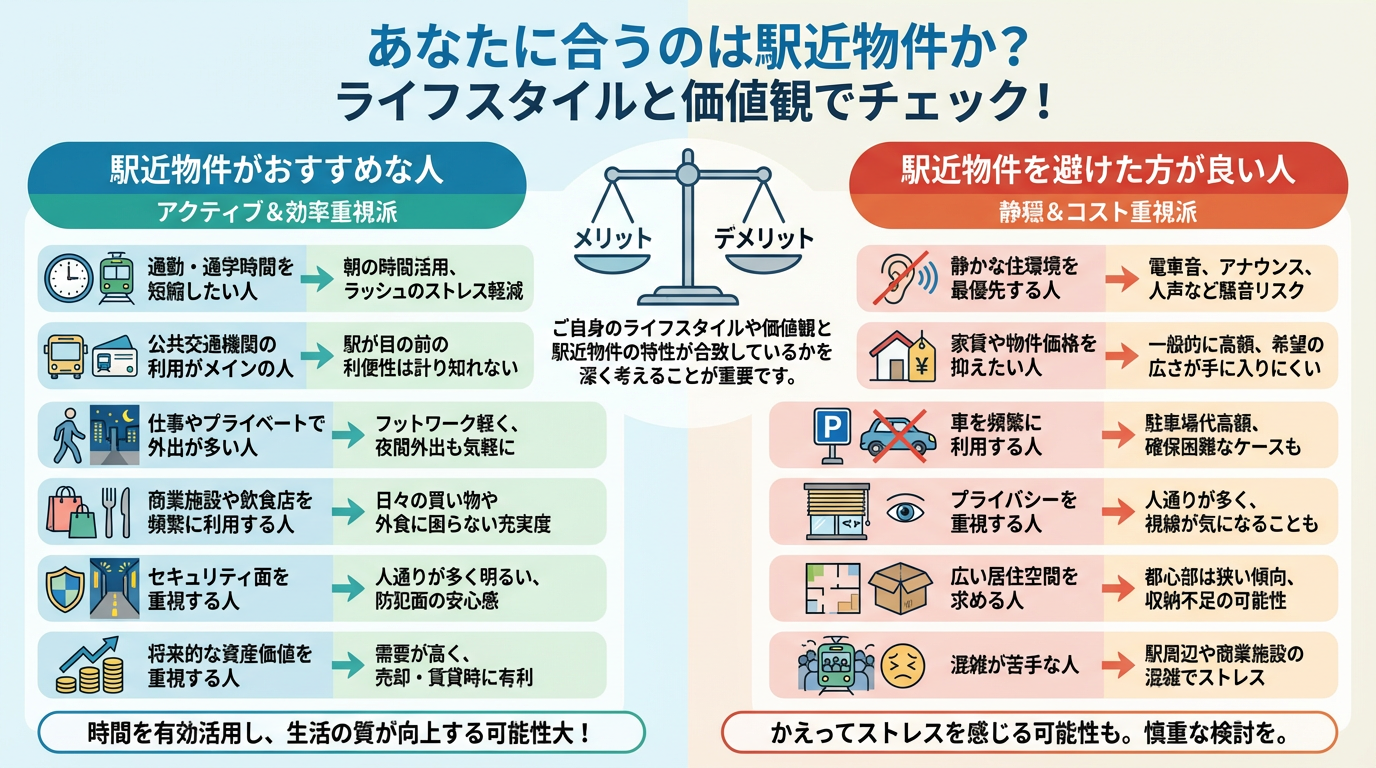 駅近物件には多くの魅力がある一方で、少なからずデメリットも存在します。理想の住まいを見つけるためには、ご自身のライフスタイルや価値観と駅近物件の特性が合致しているかを深く考えることが重要です。ここでは、駅近物件がおすすめな人、そして避けた方が良い人の特徴を具体的にご紹介します。