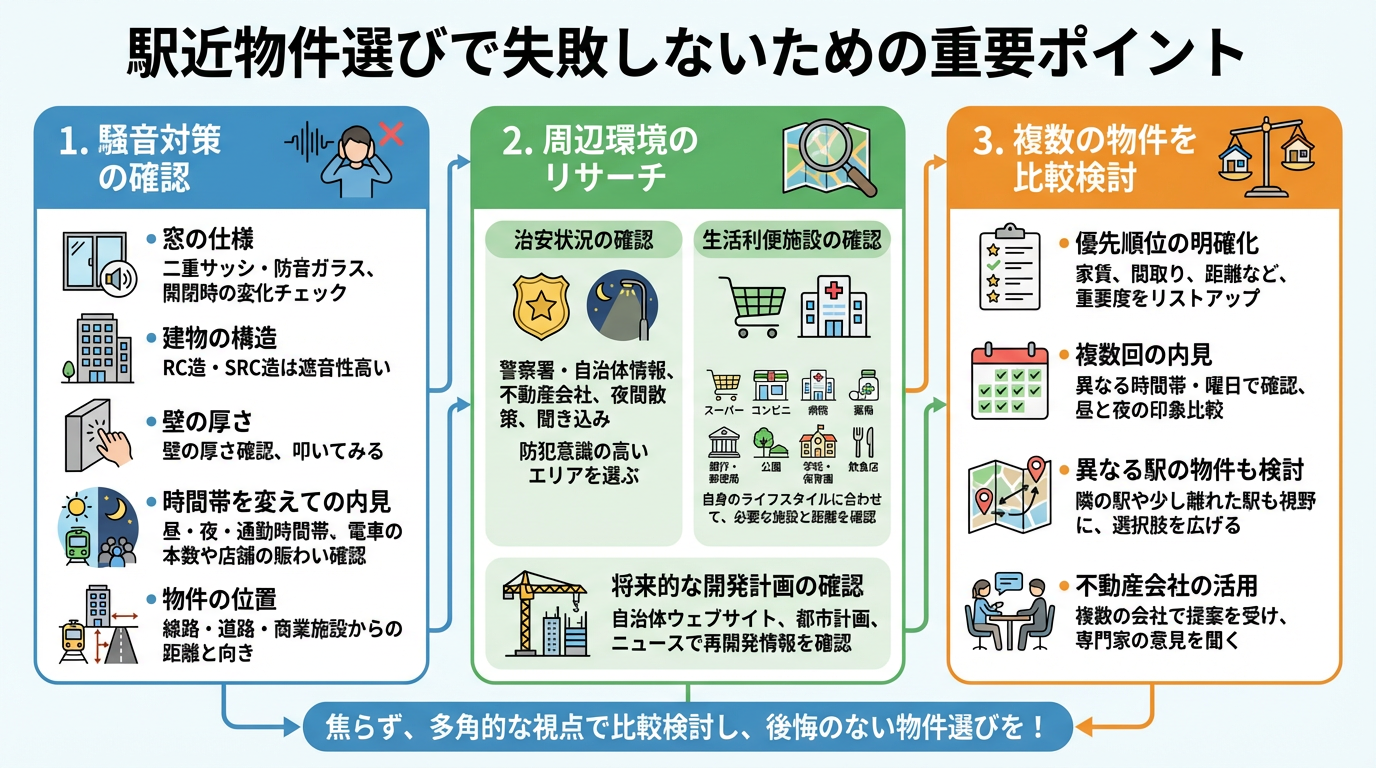 駅近物件は多くの魅力を持つ一方で、その特性ゆえに特有の注意点が存在します。理想の暮らしを実現するためには、以下のポイントをしっかりと押さえ、慎重に物件を選ぶことが重要です。