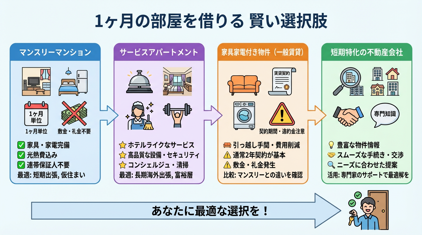 1ヶ月という短期間で部屋を借りる場合、一般的な賃貸物件の契約は難しいため、短期滞在に特化した選択肢を検討することが賢明です。ここでは、あなたのニーズに合った最適な部屋を見つけるための主要な選択肢と、それぞれの活用法について詳しく解説します。