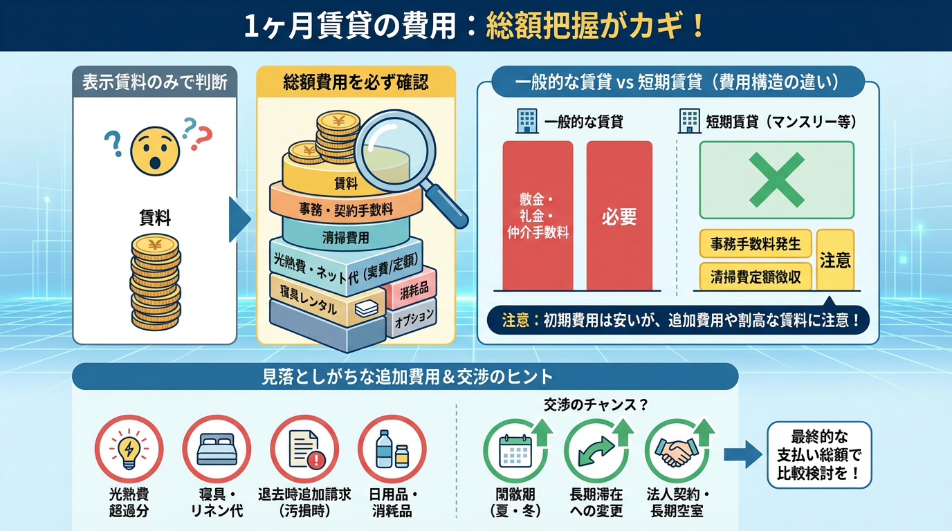 1ヶ月という短期間で部屋を借りる場合、月額の賃料だけでなく、様々な費用が発生します。契約前に総額費用を正確に把握することが、後々のトラブルを避ける上で極めて重要です。