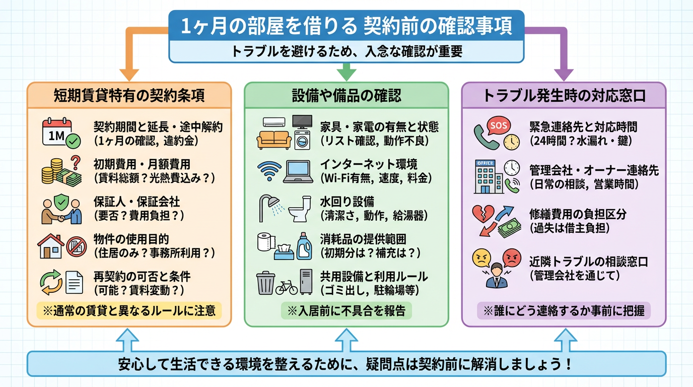 短期賃貸物件を契約する際には、通常の賃貸借契約とは異なる特有の注意点が存在します。後々のトラブルを避けるためにも、契約内容や物件の状態、緊急時の対応について、入念に確認することが極めて重要です。特に、1ヶ月という短期間の利用だからこそ、事前に疑問点を解消し、安心して生活できる環境を整えましょう。