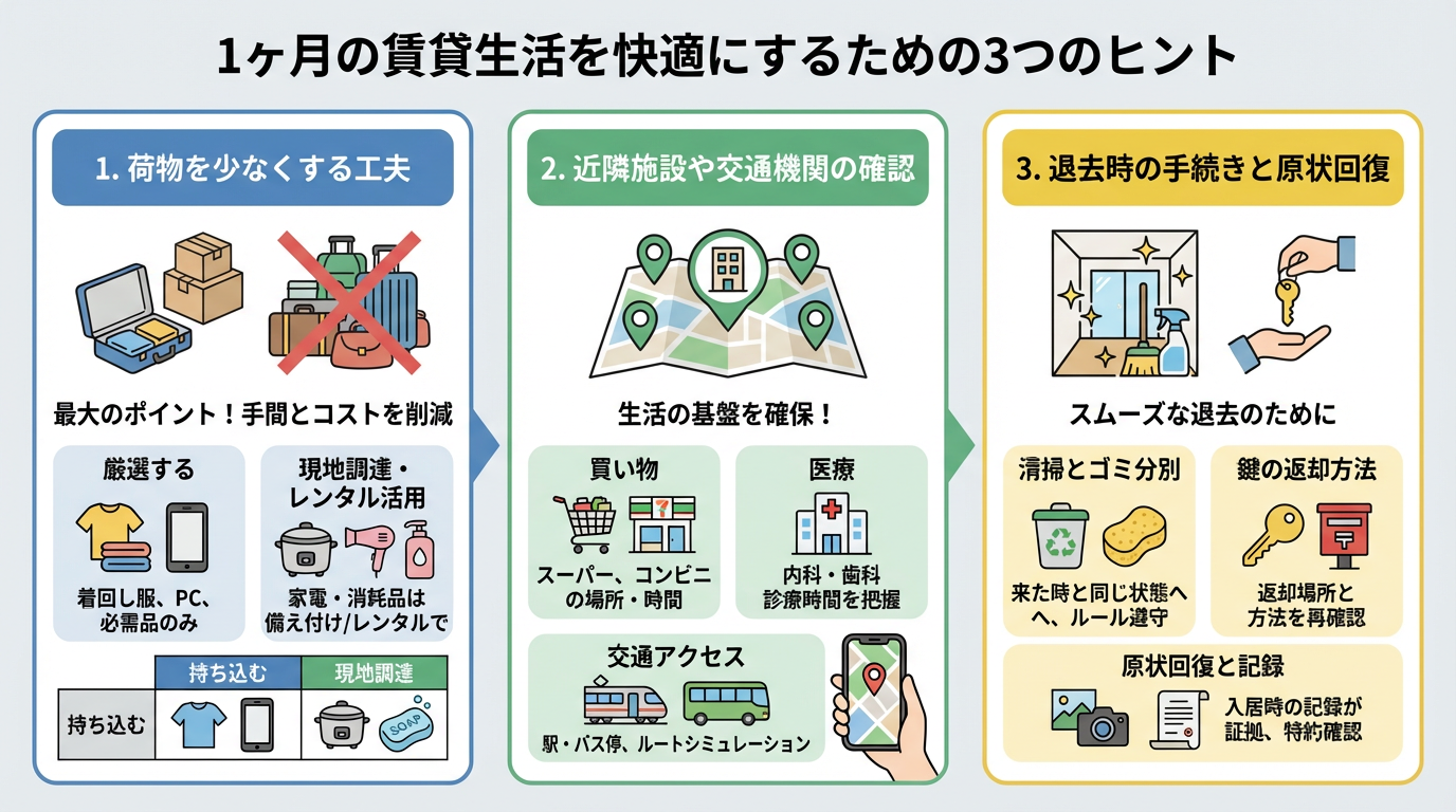 1ヶ月という限られた期間の賃貸生活を最大限に快適に過ごすためには、事前の準備と情報収集が鍵となります。ここでは、短期滞在ならではの工夫や注意点をご紹介します。